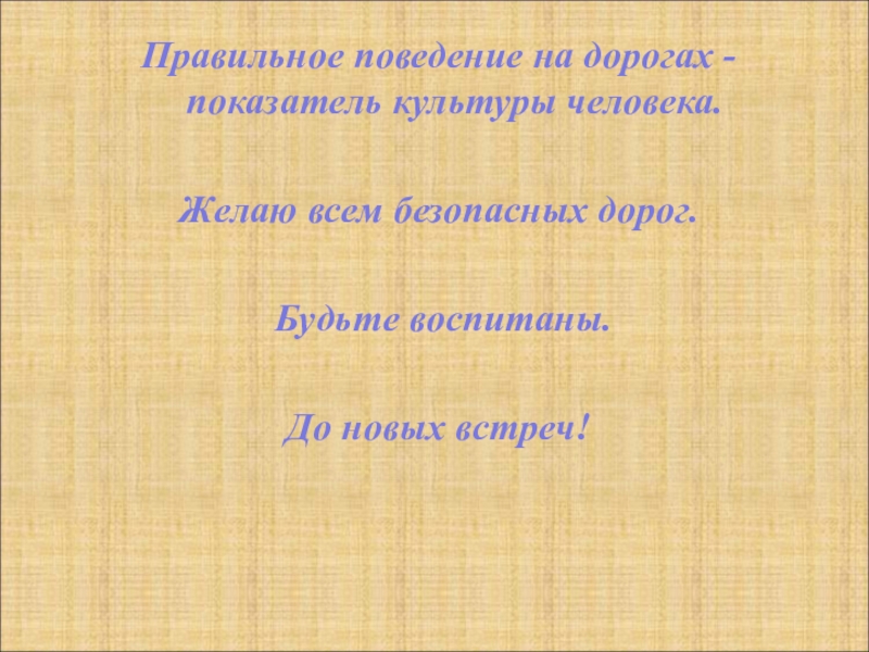 Правильное поведение на дорогах -  показатель культуры человека. Желаю всем безопасных дорог. Будьте воспитаны.До новых встреч!