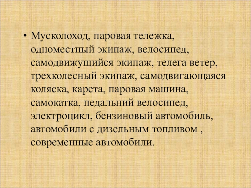 Слайд 4Мусколоход, паровая тележка, одноместный экипаж, велосипед, самодвижущийся экипаж, телега ветер, трехколесный