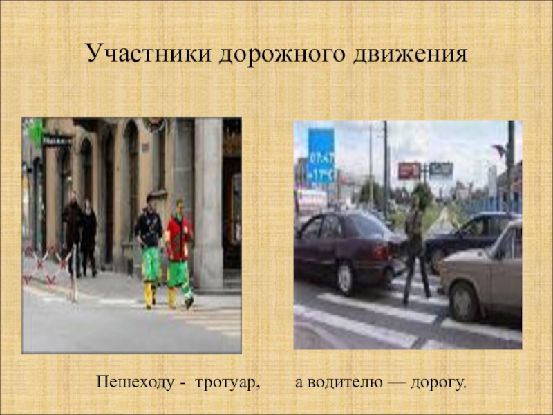 Участники дорожного движения Пешеходу - тротуар, а водителю — дорогу.
