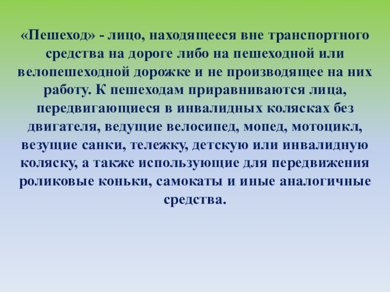Слайд 10«Пешеход» - лицо, находящееся вне транспортного средства на дороге либо на пешеходной
