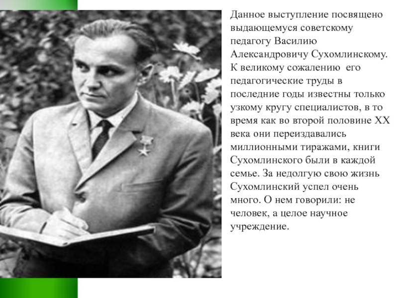 Слайд 2Данное выступление посвящено выдающемуся советскому педагогу Василию Александровичу Сухомлинскому. К великому
