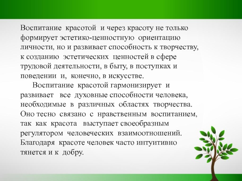 Воспитание красотой гармонизирует и развивает все духовные способности человека, необходимые в различных областях творчества. Оно тесно связано с нравственным воспитанием, так как красота выступает своеобразным регулятором человеческих взаимоотношений. Благодаря красоте человек часто интуитивно тянется и к добру.
