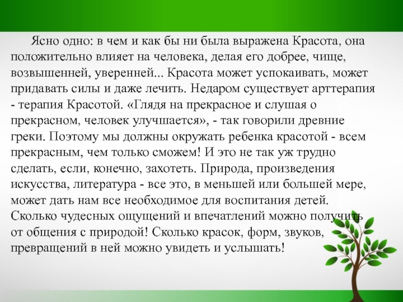 она положительно влияет на человека, делая его добрее, чище, возвышенней, уверенней... Красота может успокаивать, может придавать силы и даже лечить. Недаром существует арттерапия - терапия Красотой. «Глядя на прекрасное и слушая о прекрасном, человек улучшается», - так говорили древние греки. Поэтому мы должны окружать ребенка красотой - всем прекрасным, чем только сможем! И это не так уж трудно сделать, если, конечно, захотеть. Природа, произведения искусства, литература - все это, в меньшей или большей мере, может дать нам все необходимое для воспитания детей. Сколько чудесных ощущений и впечатлений можно получить от общения с природой! Сколько красок, форм, звуков, превращений в ней можно увидеть и услышать!