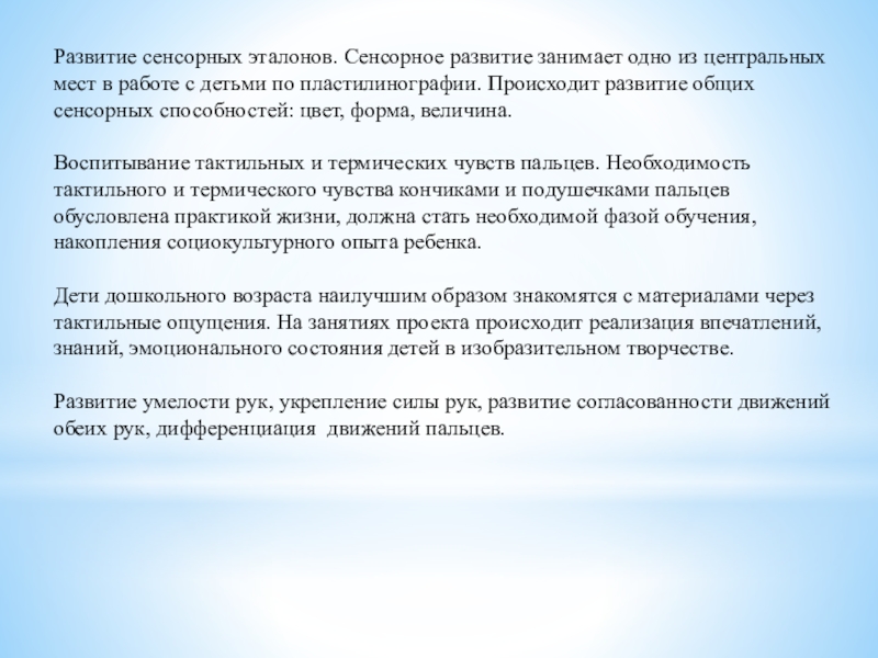 Слайд 19Развитие сенсорных эталонов. Сенсорное развитие занимает одно из центральных мест в