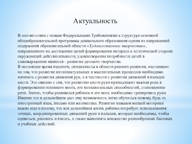 В настоящее время педагоги, специалисты в области раннего развития, настаивают на том, что развитие интеллектуальных и мыслительных процессов необходимо начинать с развития движения рук, а в частности с развития движений в пальцах кисти. Это связано с тем, что развитию кисти руки принадлежит важная роль в формировании головного мозга, его познавательных способностей, становлению речи. Значит, чтобы развивался ребенок и его мозг, необходимо тренировать руки. Именно это в дальнейшем даст ему возможность легко обучаться новому, будь то иностранный язык, письмо или математика. Развитие навыков мелкой моторики важно еще и потому, что вся дальнейшая жизнь ребенка потребует использования точных, координированных движений руки и пальцев, которые необходимы, чтобы одеваться, рисовать и писать, а также выполнять множество разнообразных бытовых и учебных действий.