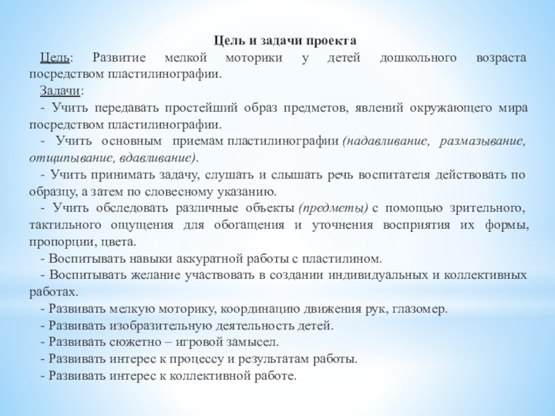 Цель: Развитие мелкой моторики у детей дошкольного возраста посредством пластилинографии.