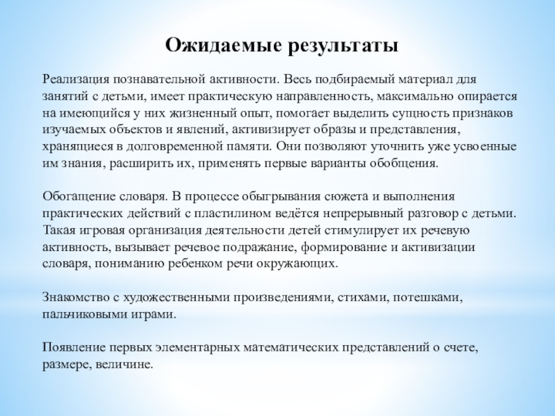 Обогащение словаря. В процессе обыгрывания сюжета и выполнения практических действий с пластилином ведётся непрерывный разговор с детьми. Такая игровая организация деятельности детей стимулирует их речевую активность, вызывает речевое подражание, формирование и активизации словаря, пониманию ребенком речи окружающих.
