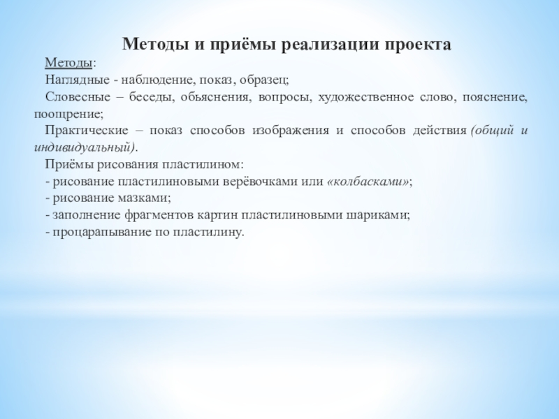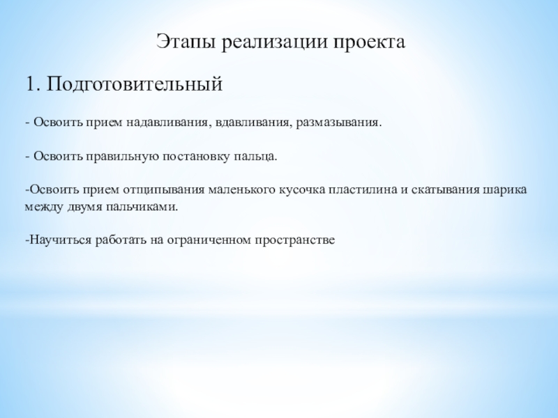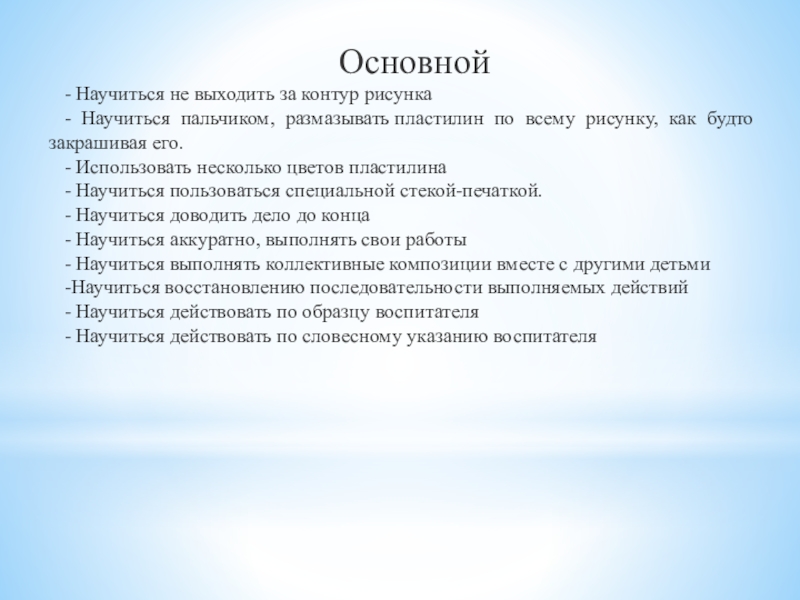 - Учить основным приемам пластилинографии (надавливание, размазывание, отщипывание, вдавливание).