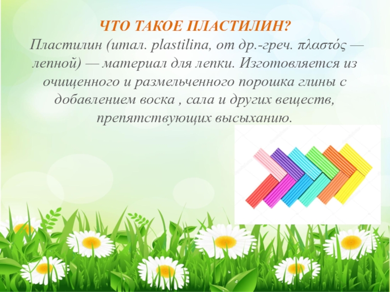 Пластилин (итал. plastilina, от др.-греч. πλαστός — лепной) — материал для лепки. Изготовляется из очищенного и размельченного порошка глины с добавлением воска , сала и других веществ, препятствующих высыханию.