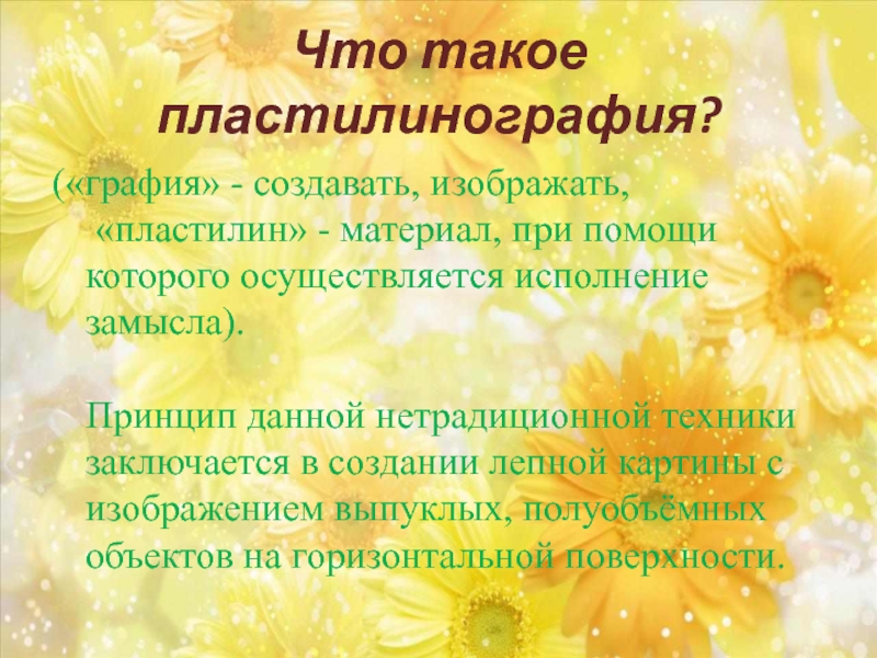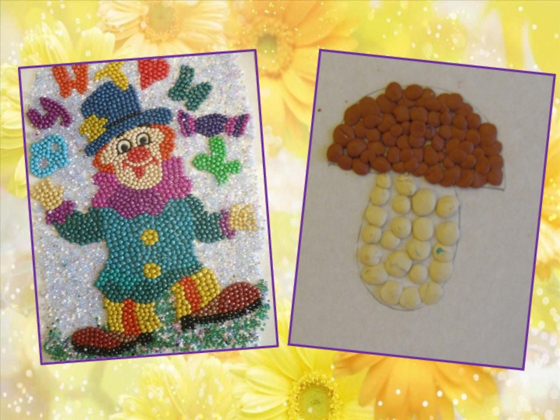 Слайд 14Мозаичная пластилинография - изображение лепной картины на горизонтальной поверхности с помощью