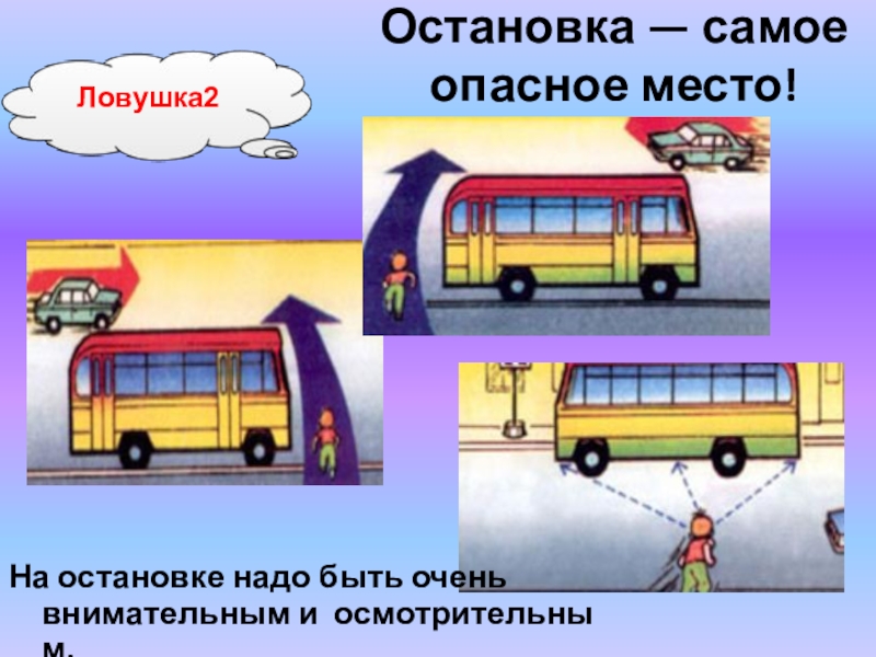 Остановка — самое опасное место!Ловушка2На остановке надо быть очень внимательным и  осмотрительным.