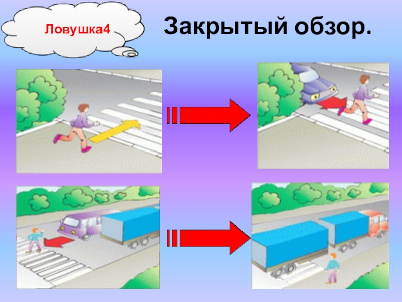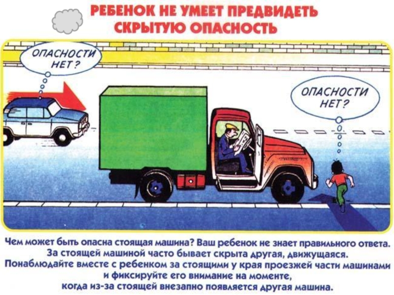 Стоящая машина.Не торопись!  Из-за стоящей машины внезапно может появиться другая  движущаяся машина. Сначала надо убедиться в безопасности!Ловушка7