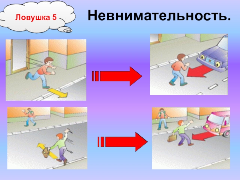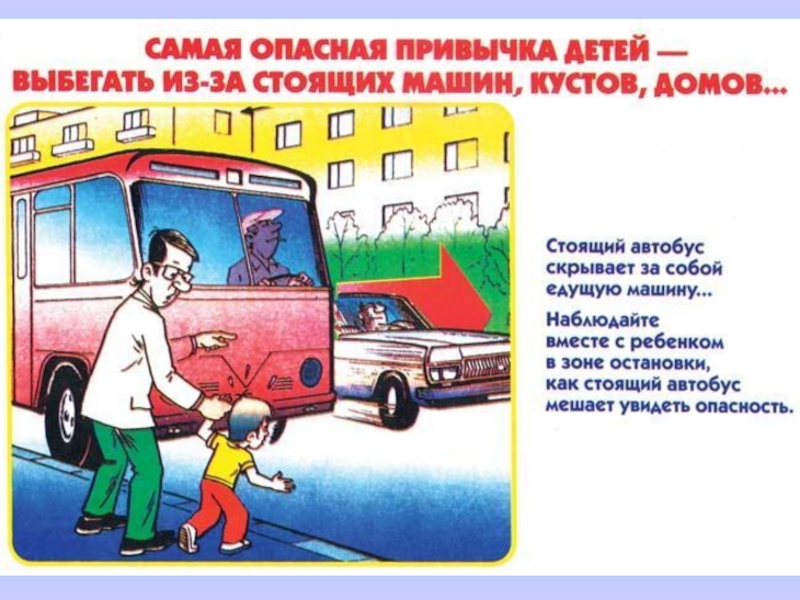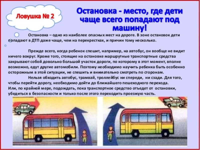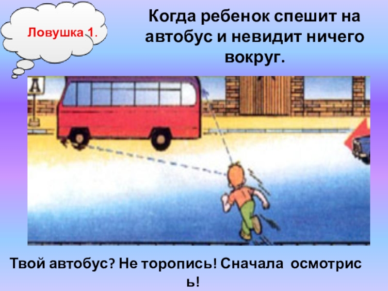 Когда ребенок спешит на  автобус и невидит ничего  вокруг.Твой автобус? Не торопись! Сначала  осмотрись!Ловушка 1.
