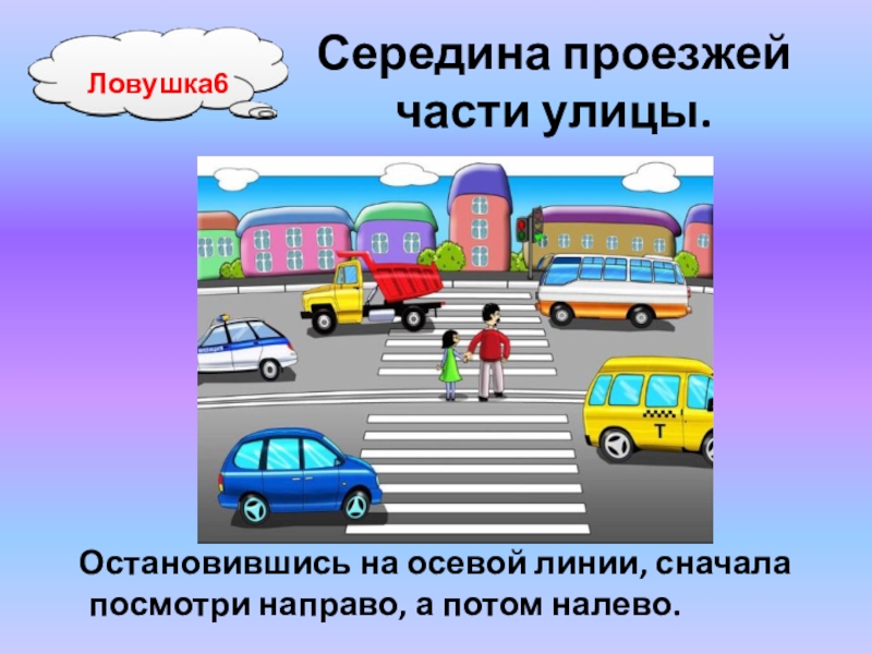 Середина проезжей части улицы.  Остановившись на осевой линии, сначала посмотри направо, а потом налево.Ловушка6