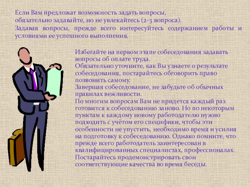 Задавая вопросы, прежде всего интересуйтесь содержанием работы и условиями ее успешного выполнения.