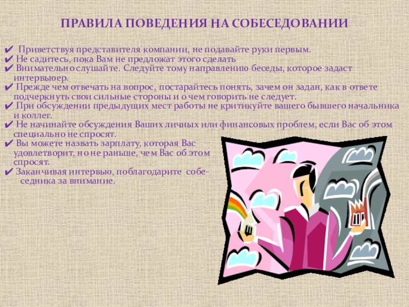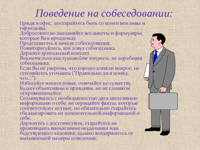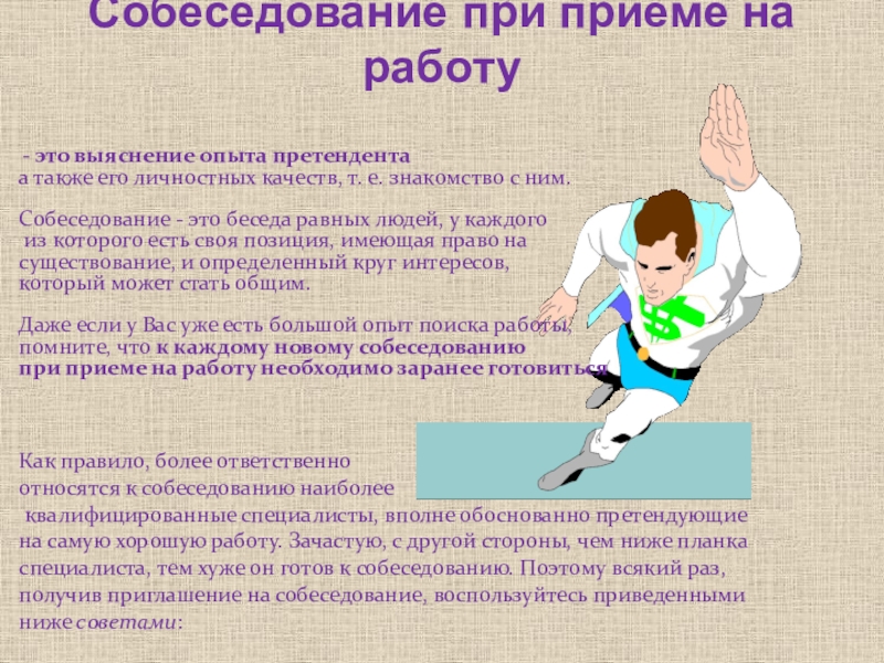 квалифицированные специалисты, вполне обоснованно претендующие на самую хорошую работу. Зачастую, с другой стороны, чем ниже планка специалиста, тем хуже он готов к собеседованию. Поэтому всякий раз, получив приглашение на собеседование, воспользуйтесь приведенными ниже советами: