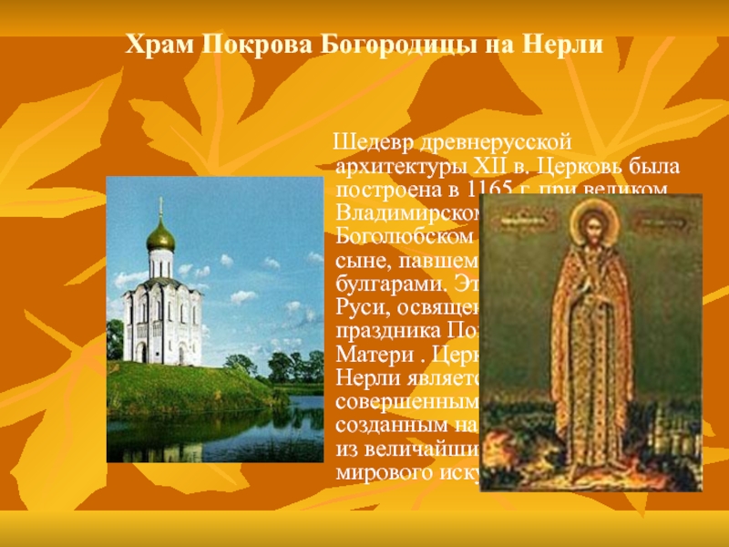 Церковь была построена в 1165 г. при великом Владимирском князе Андрее Боголюбском в память о его сыне, павшем в бою с волжскими булгарами. Это первый храм на Руси, освященный в честь праздника Покрова Божией Матери . Церковь Покрова на Нерли является не только самым совершенным храмом, созданным на Руси, но и одним из величайших памятников мирового искусства.