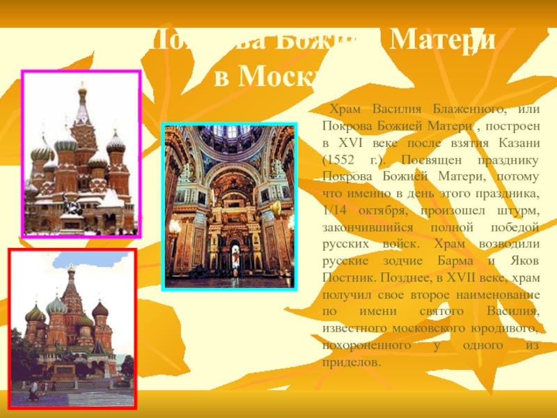 Покрова Божией Матери , построен в XVI веке после взятия Казани (1552 г.). Посвящен празднику Покрова Божией Матери, потому что именно в день этого праздника, 1/14 октября, произошел штурм, закончившийся полной победой русских войск. Храм возводили русские зодчие Барма и Яков Постник. Позднее, в XVII веке, храм получил свое второе наименование по имени святого Василия, известного московского юродивого, похороненного у одного из приделов.