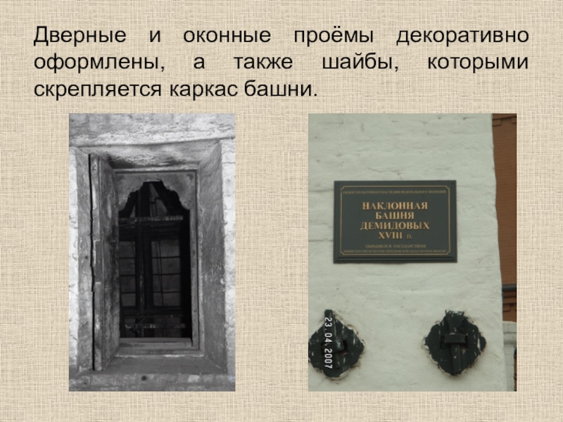 Слайд 9Дверные и оконные проёмы декоративно оформлены, а также шайбы, которыми скрепляется