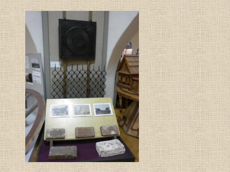 Слайд 13Фрагмент экспозиции музея: на подиуме – вафельницы, рядом – садовая мебель