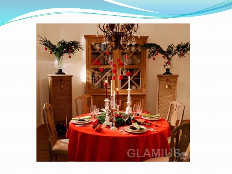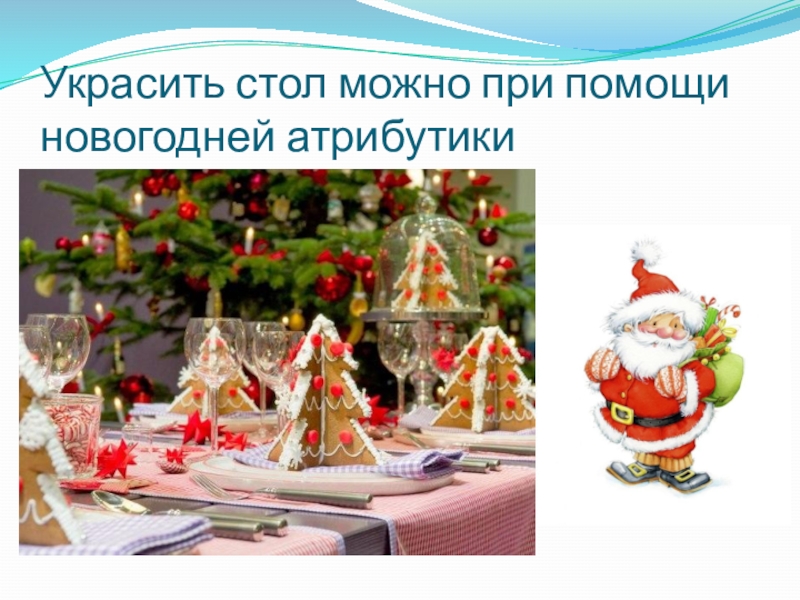 Слайд 9Украсить стол можно при помощи новогодней атрибутики