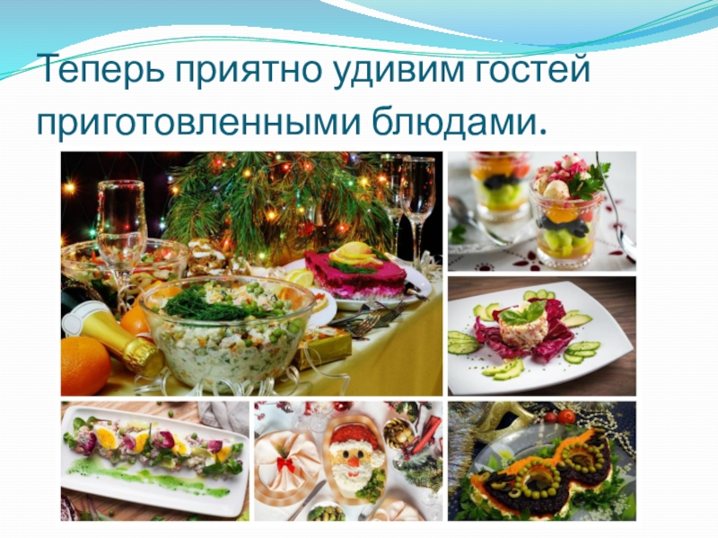 Слайд 13Теперь приятно удивим гостей приготовленными блюдами.