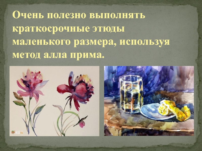 Слайд 9Очень полезно выполнять краткосрочные этюды маленького размера, используя метод