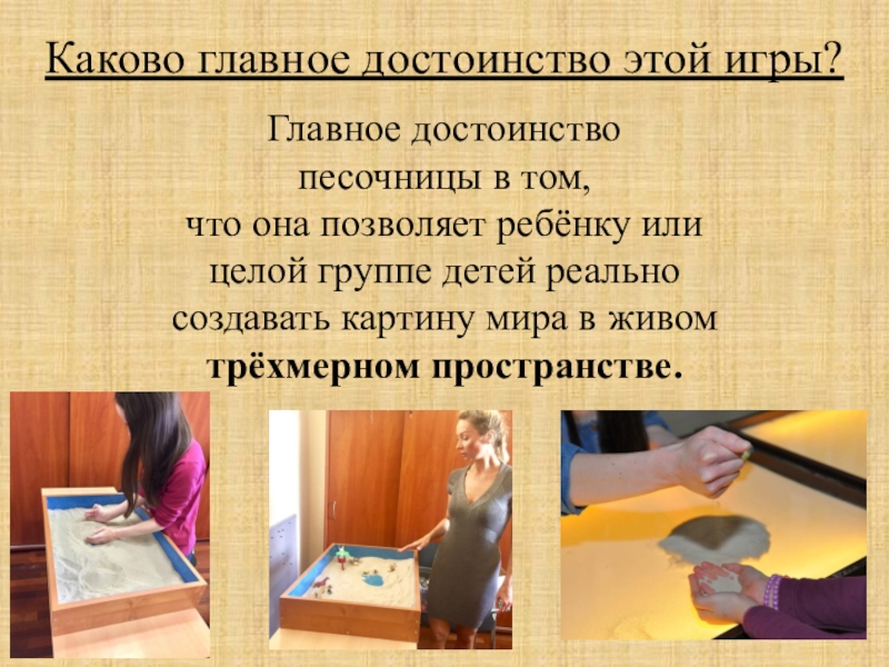 Каково главное достоинство этой игры?Главное достоинство песочницы в том, что она позволяет ребёнку или целой группе детей