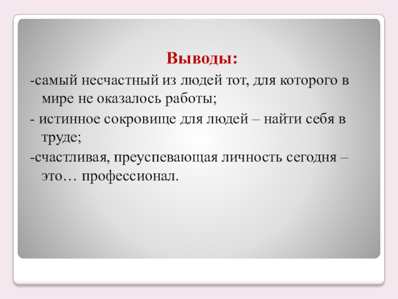 Выводы:-самый несчастный из людей тот, для которого в мире не оказалось работы; - истинное сокровище для людей