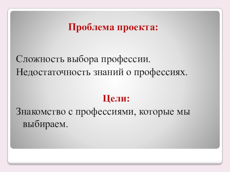 Проблема проекта: Сложность выбора профессии.Недостаточность знаний о профессиях.Цели:Знакомство с профессиями, которые мы выбираем.