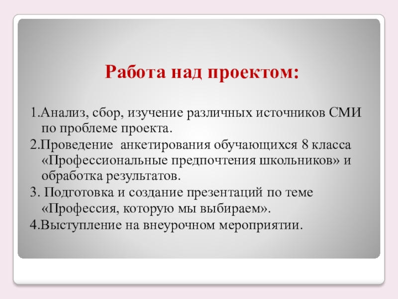 Работа над проектом:1.Анализ, сбор, изучение различных источников СМИ по проблеме проекта.2.Проведение анкетирования обучающихся 8 класса «Профессиональные