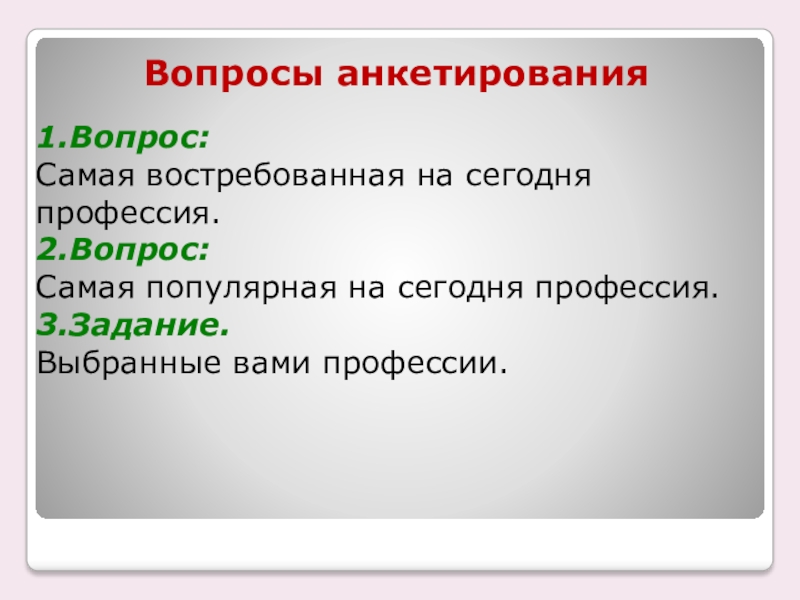 Вопросы анкетирования1.Вопрос: Самая востребованная на сегодня профессия.2.Вопрос: Самая популярная на сегодня профессия.3.Задание.Выбранные вами профессии.
