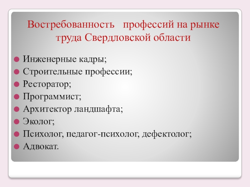 Востребованность  профессий на рынке труда Свердловской области  Инженерные кадры;Строительные профессии;Ресторатор;Программист;Архитектор ландшафта;Эколог;Психолог, педагог-психолог,