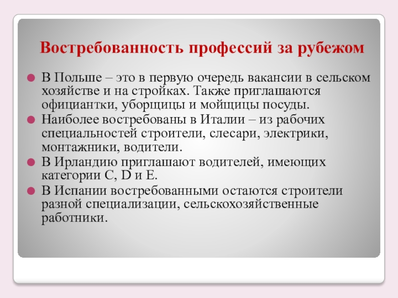 Востребованность профессий за рубежомВ Польше – это в первую очередь вакансии в сельском хозяйстве и на