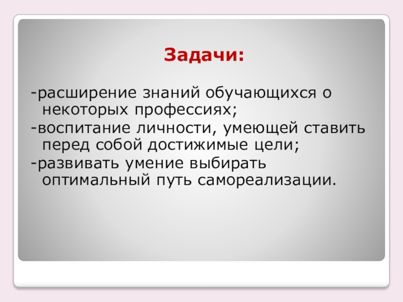 Задачи:-расширение знаний обучающихся о некоторых профессиях;-воспитание личности, умеющей ставить перед собой достижимые цели;-развивать умение
