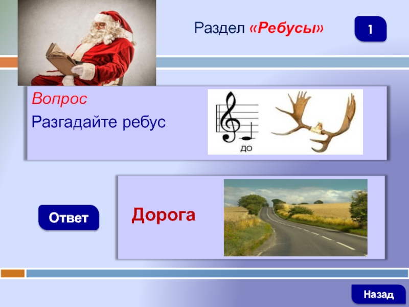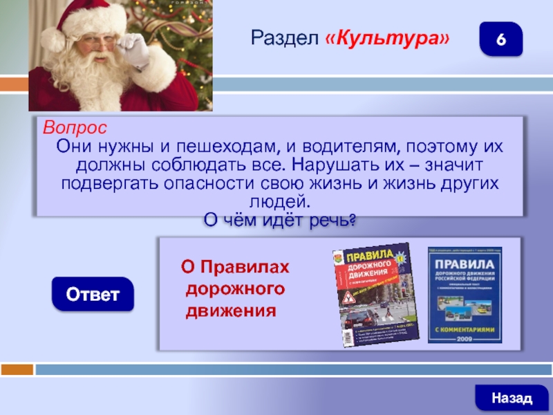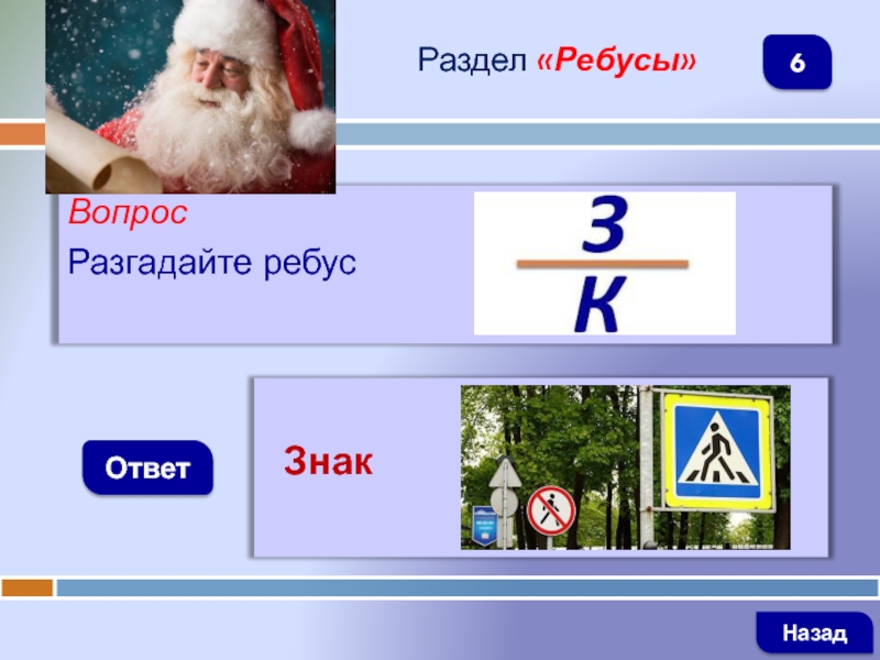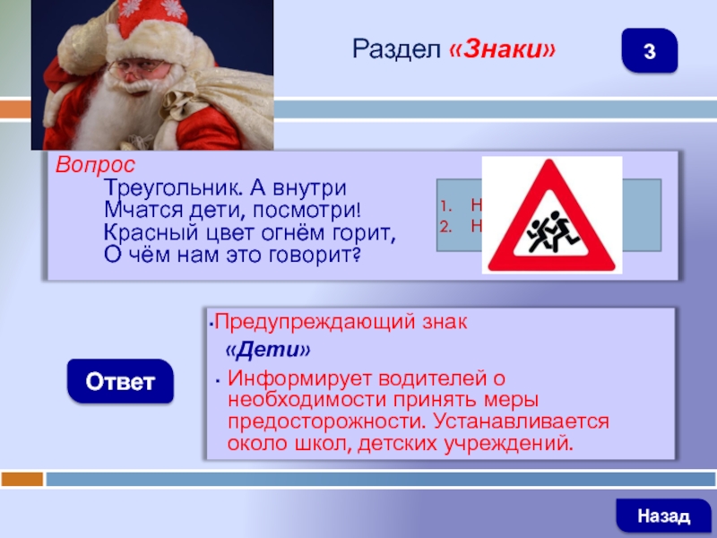 ВопросТреугольник. А внутриМчатся дети, посмотри!Красный цвет огнём горит,О чём нам это говорит?ОтветРаздел «Знаки»Предупреждающий знак  «Дети»Информирует водителей