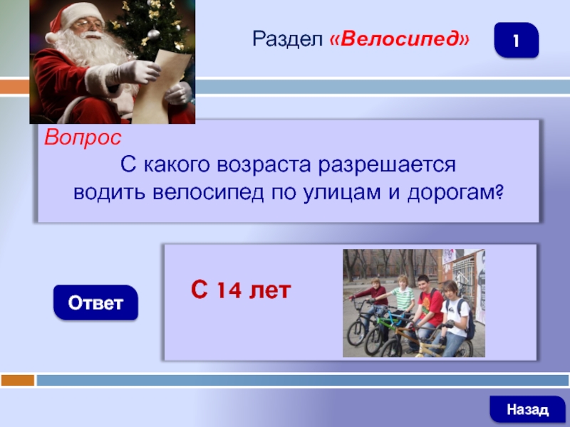 ВопросС какого возраста разрешается водить велосипед по улицам и дорогам?ОтветРаздел «Велосипед»  С 14 летНазад1
