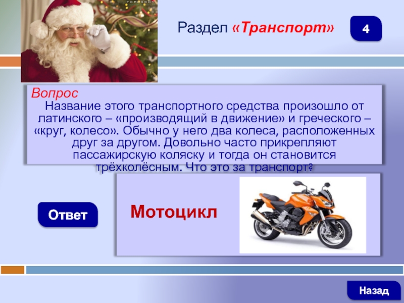 ВопросНазвание этого транспортного средства произошло от латинского – «производящий в движение» и греческого – «круг, колесо». Обычно