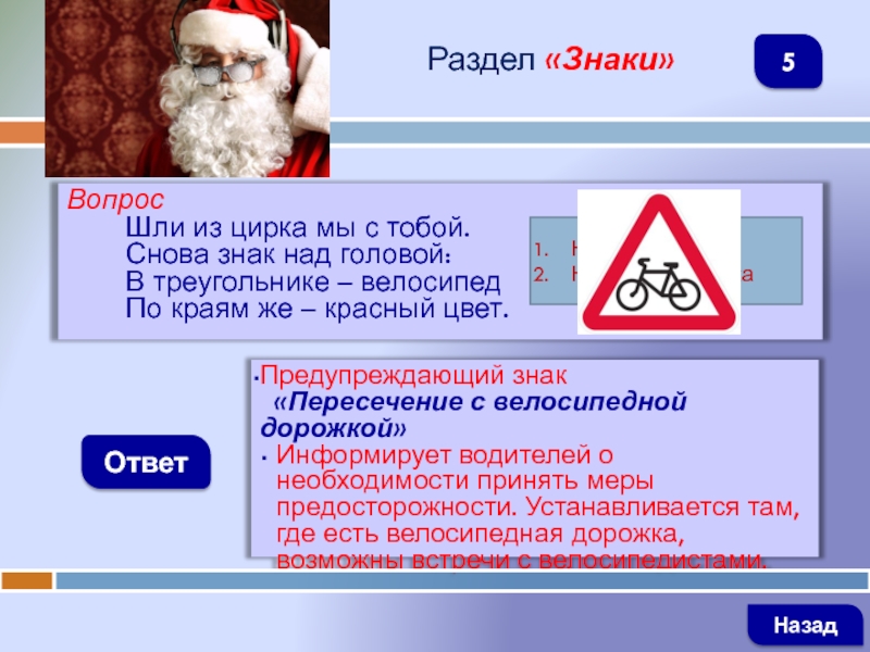ВопросШли из цирка мы с тобой.Снова знак над головой:В треугольнике – велосипедПо краям же – красный цвет.ОтветРаздел