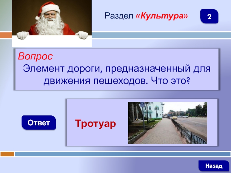 ВопросЭлемент дороги, предназначенный для движения пешеходов. Что это?ОтветРаздел «Культура» Тротуар Назад2