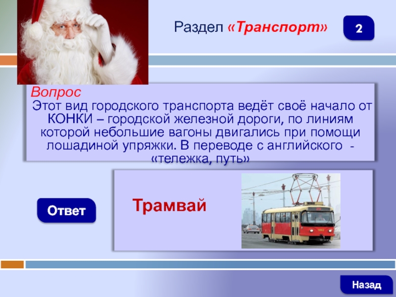 ВопросЭтот вид городского транспорта ведёт своё начало от КОНКИ – городской железной дороги, по линиям которой небольшие