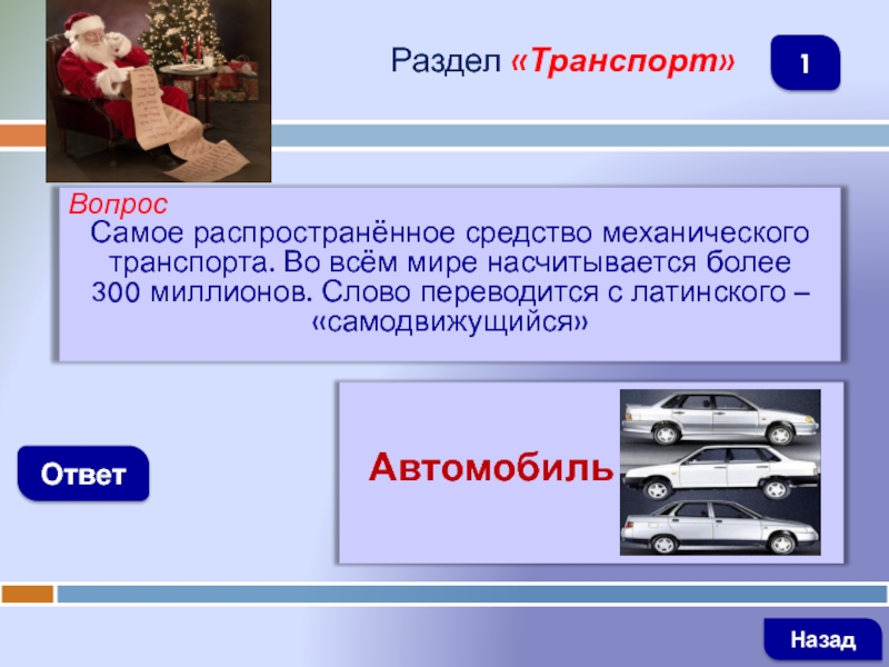 ВопросСамое распространённое средство механического транспорта. Во всём мире насчитывается более 300 миллионов. Слово переводится с латинского –