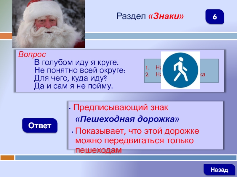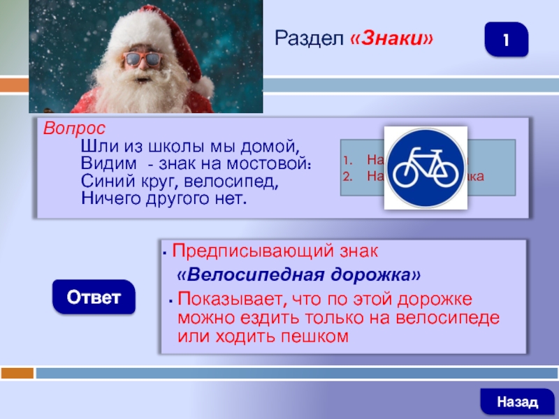 ВопросШли из школы мы домой, Видим - знак на мостовой: Синий круг, велосипед, Ничего другого нет.ОтветРаздел «Знаки»