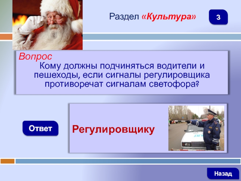 ВопросКому должны подчиняться водители и пешеходы, если сигналы регулировщика противоречат сигналам светофора?ОтветРаздел «Культура»Регулировщику Назад3