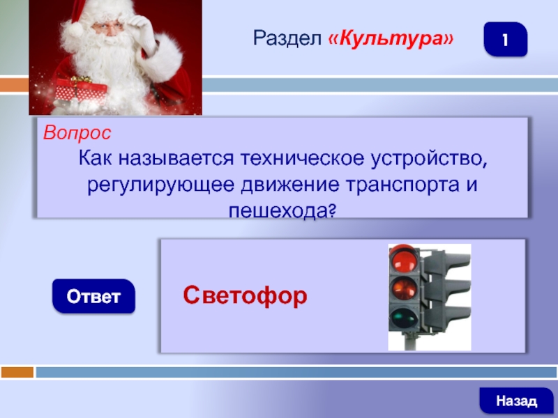 ВопросКак называется техническое устройство, регулирующее движение транспорта и пешехода?ОтветРаздел «Культура» Светофор Назад1