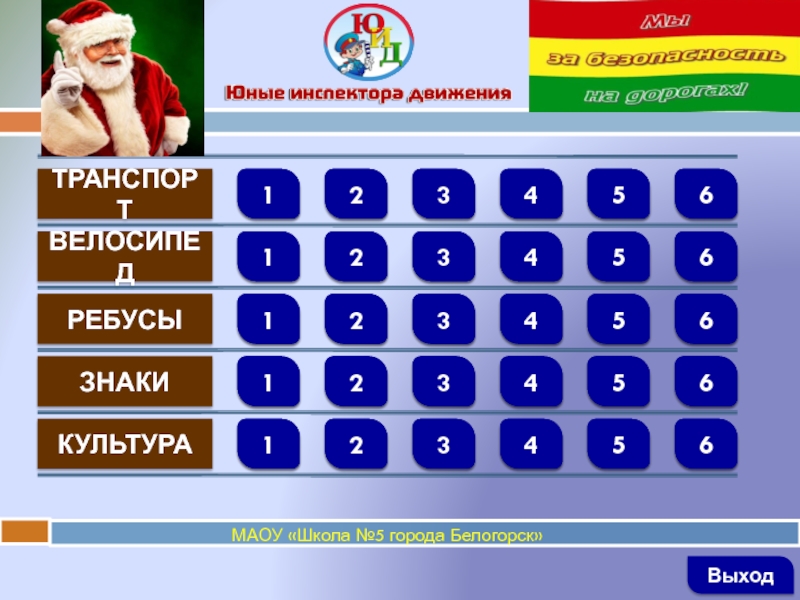 ТРАНСПОРТВЕЛОСИПЕДРЕБУСЫЗНАКИКУЛЬТУРА   123456123456123456123456123456ВыходМАОУ «Школа №5 города Белогорск»