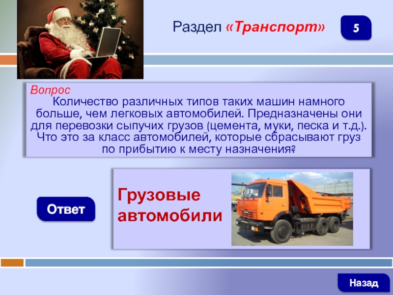 ВопросКоличество различных типов таких машин намного больше, чем легковых автомобилей. Предназначены они для перевозки сыпучих грузов (цемента,