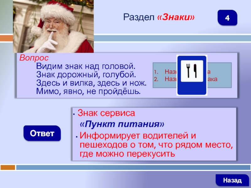 ВопросВидим знак над головой.Знак дорожный, голубой.Здесь и вилка, здесь и нож.Мимо, явно, не пройдёшь.ОтветРаздел «Знаки» Знак сервиса