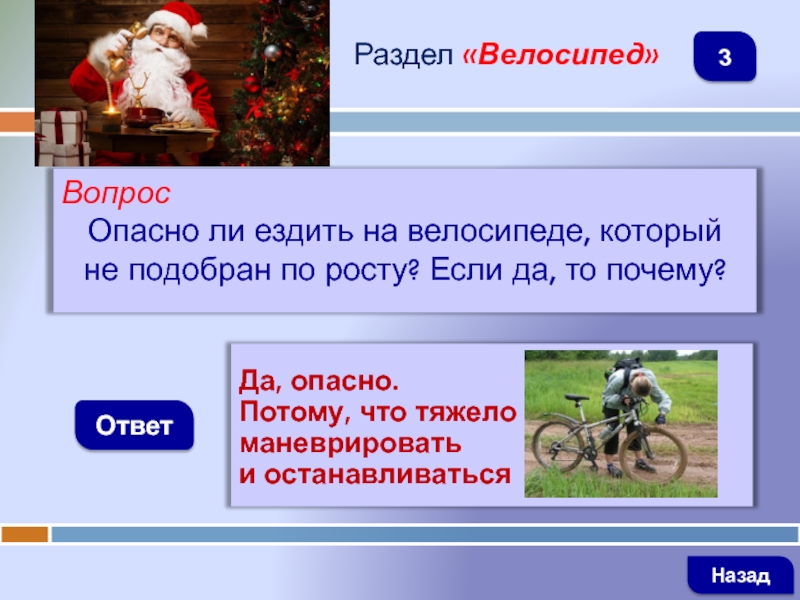 ВопросОпасно ли ездить на велосипеде, который не подобран по росту? Если да, то почему?ОтветРаздел «Велосипед»Да, опасно.Потому, что