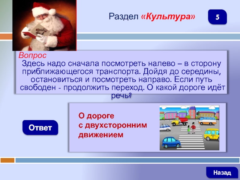 ВопросЗдесь надо сначала посмотреть налево – в сторону приближающегося транспорта. Дойдя до середины, остановиться и посмотреть направо.